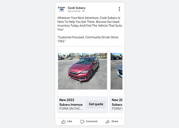Long after a consumer has left your website, DEP’s Facebook Inventory-Based VDP Remarketing allows you to stay in front of shoppers while they browse on their favorite social media apps. Right after a website visitor has viewed a Vehicle Details Page (VDP), this low funnel campaign will follow that prospect to repeatedly display vehicle images on their Facebook news feeds, Instagram feeds, etc., keeping you, and your inventory, top of mind.